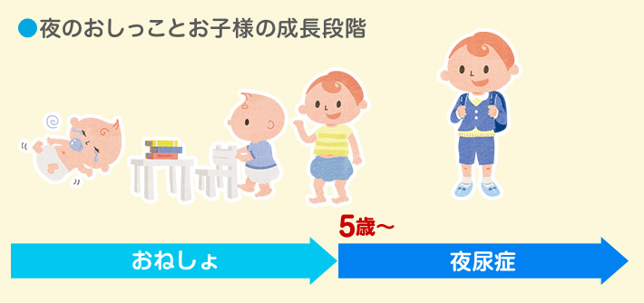 多くの子どもは自然におねしょから自立していきますが、5歳をすぎても夜のおもらしが月に1回以上3ヶ月続く場合「夜尿症」と診断されます。生活指導や治療で改善できるものがほとんどですから、小児科の先生に相談してみましょう。