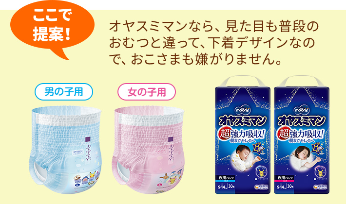「抗利尿ホルモン」は、睡眠のリズムがきちんと整うことで増えていきます。夜、安心してゆっくり眠るためには、夜間はおむつなどをするのもよいでしょう。「子どもが、赤ちゃんみたいだからおむつはイヤ!」という場合は、子どもの自尊心を尊重して、オヤスミマンのような夜用キッズパンツを利用するのもいい方法です。