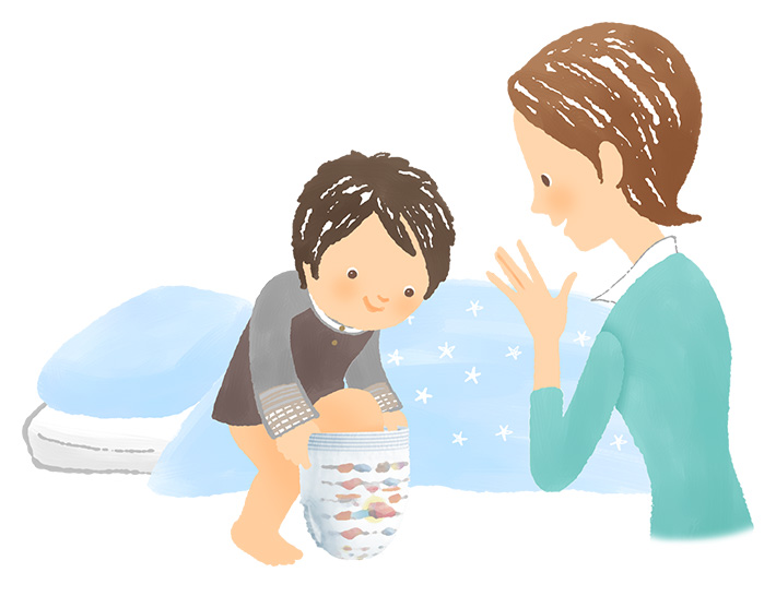 昼間のおむつがとれているのに、夜だけおむつという「赤ちゃん扱い」が子どもの自尊心を傷つけることが心配であれば、夜用キッズパンツのようなものにするのもいいですね。おむつをしていれば、おしっこで体全体がぐっしょり濡れてしまうという不快感を味合わずにすみますし、布団を濡らさないので、ママ・パパもイライラしたり、きつく叱ってしまったりということもないでしょう。